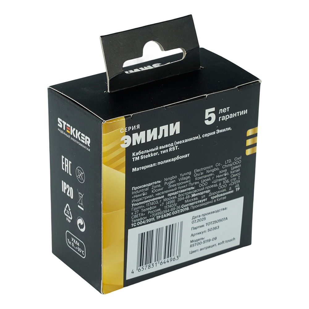 Производитель STEKKER Полное наименование Вывод кабеля С/У Антрацит Эмили Код производителя (Артикул) 50363 Серия Эмили Код Просвет 014016 Высота изделия 35 Номин. ток - Гарантийный срок, г 5 лет Единица измерения шт Степень защиты (IP) IP20 Длина Упаковки, мм 78 Ширина Упаковки, мм 58 Цвет антрацит, soft touch -