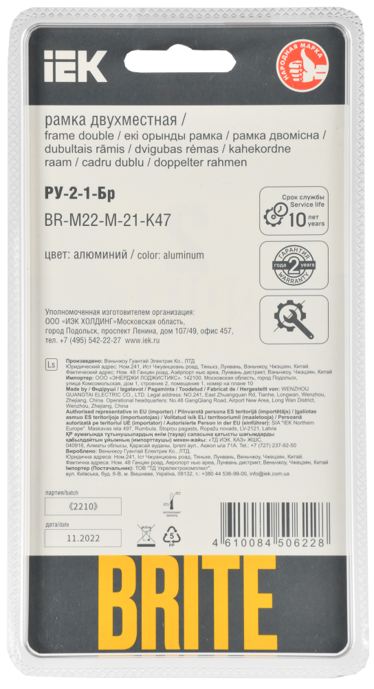 Производитель IEK (ИЭК) Полное наименование Рамка 2-я Металл Алюминий RE AL Brite Код производителя (Артикул) BR-M22-M-21-K47 Серия Brite Код Просвет 021916 Количество постов (мест) 2.0 Материал Металл Подходит для установки в кабель-канал Нет Прозрачный Нет С откидной крышкой Нет Степень защиты (IP) IP20 Тип поверхности Матовый (-ая) Высота, мм 94.0 Цвет Алюминий -