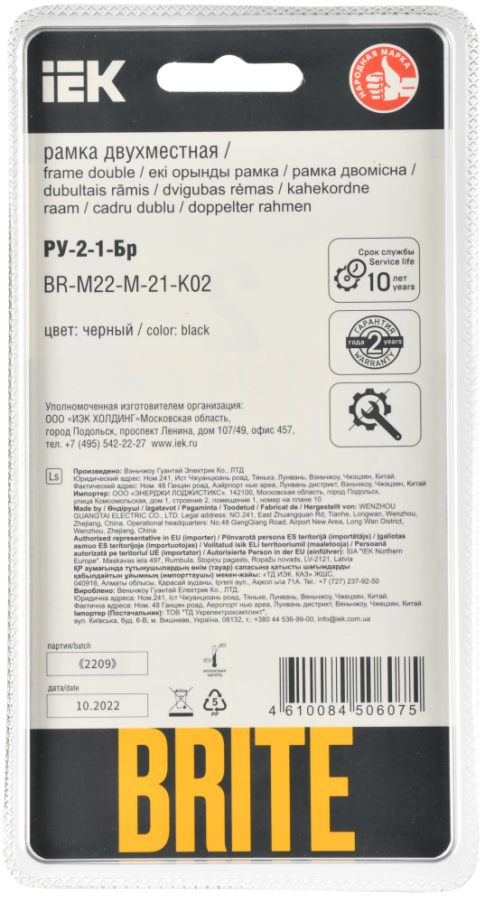 Производитель IEK (ИЭК) Полное наименование Рамка 2-я Металл Черный Brite Код производителя (Артикул) BR-M22-M-21-K02 Серия Brite Код Просвет 021913 Количество постов (мест) 2.0 Материал Металл Подходит для установки в кабель-канал Нет Прозрачный Нет С откидной крышкой Нет Степень защиты (IP) IP20 Тип поверхности Матовый (-ая) Высота, мм 94.0 Цвет Черный -