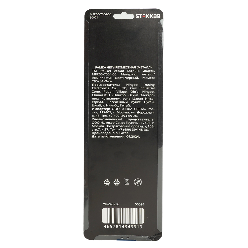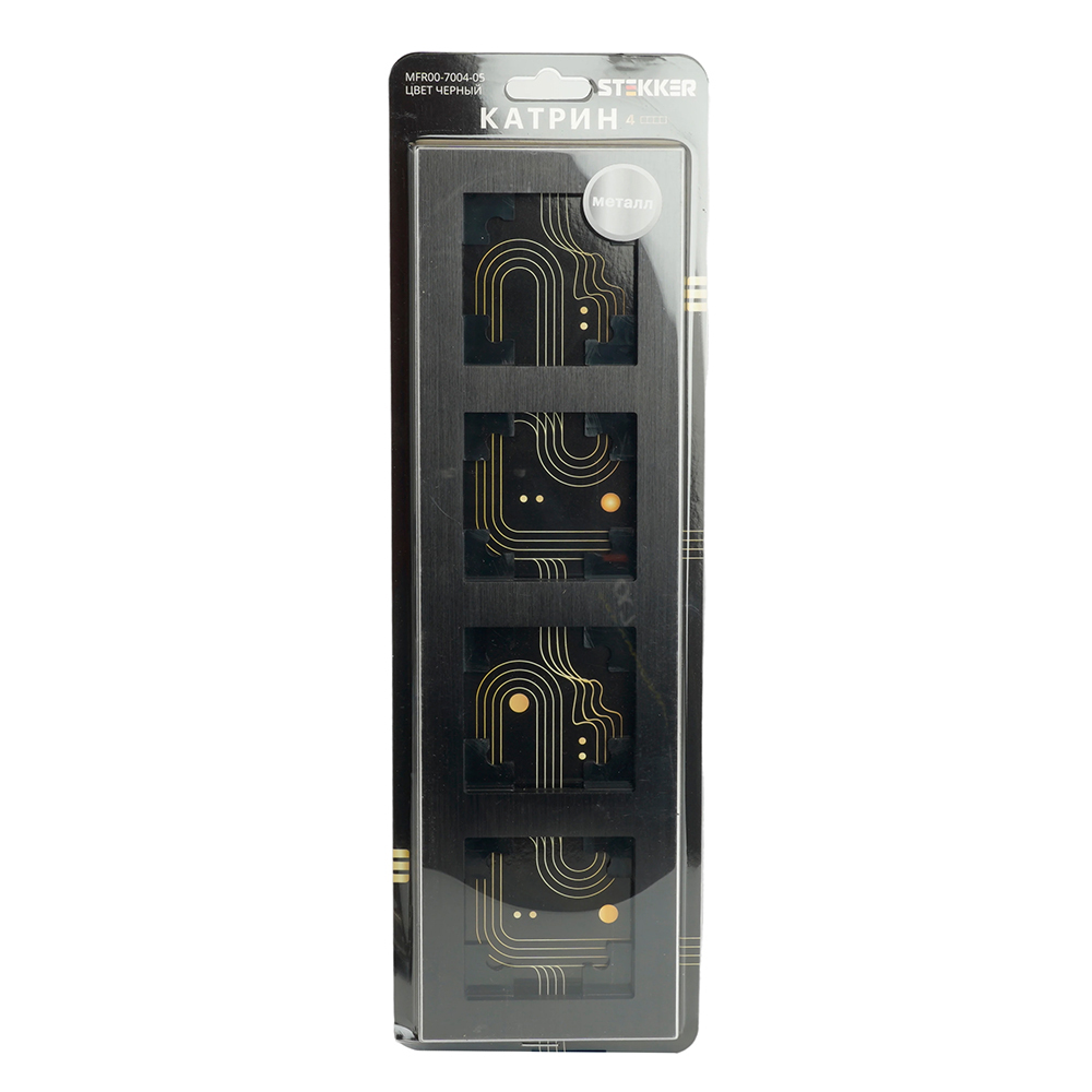 Производитель STEKKER Полное наименование Рамка 4-я металл Черный Катрин Код производителя (Артикул) 50024 Серия Катрин Код Просвет 017808 Высота изделия 9 Единица измерения шт Высота Упаковки, мм 12 Длина Упаковки, мм 300 Цвет Черный -