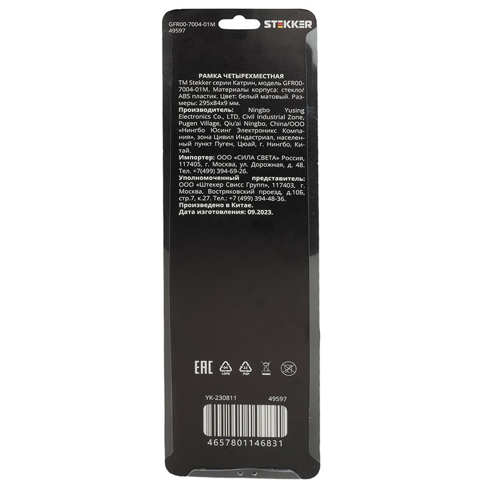 Производитель STEKKER Полное наименование Рамка 4-я стекло Белый матовый Катрин Код производителя (Артикул) 49597 Серия Катрин Код Просвет 015686 Высота изделия 9 Единица измерения шт Высота Упаковки, мм 10 Длина Упаковки, мм 340 Ширина Упаковки, мм 105 Цвет Белый матовый -