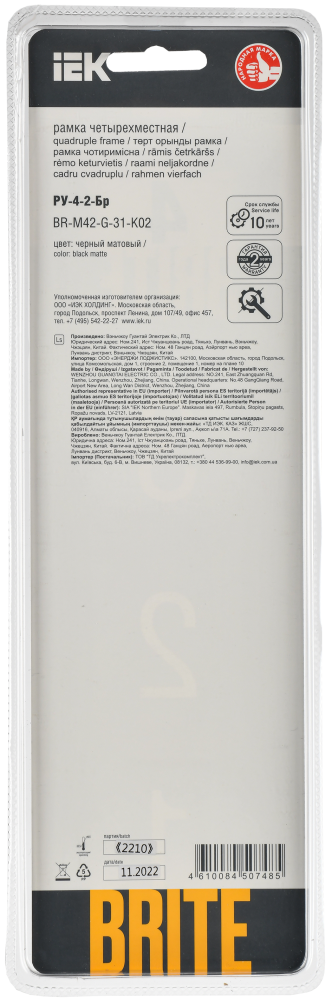 Производитель IEK (ИЭК) Полное наименование Рамка 4-я Стекло Черный матовый Brite Код производителя (Артикул) BR-M42-G-31-K02 Серия Brite Код Просвет 021956 Глубина, мм 10.3 Количество постов (мест) 4.0 Материал Стекло Подходит для установки в кабель-канал Нет Прозрачный Нет С откидной крышкой Нет Степень защиты (IP) IP20 Тип поверхности Матовый (-ая) Высота, мм 88 Цвет Черный -