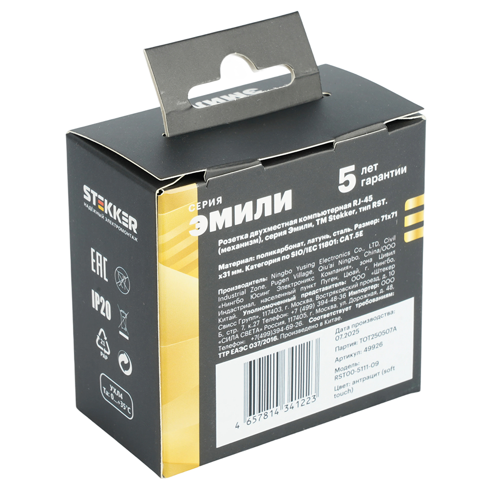 Производитель STEKKER Полное наименование Розетка RJ45+RJ45 С/У Антрацит Эмили Код производителя (Артикул) 49926 Серия Эмили Код Просвет 013934 Высота изделия 30 Номин. ток 0,35 Гарантийный срок, г 5 лет Единица измерения шт Степень защиты (IP) IP20 Высота Упаковки, мм 44 Длина Упаковки, мм 82 Ширина Упаковки, мм 80 Цвет антрацит, soft touch -