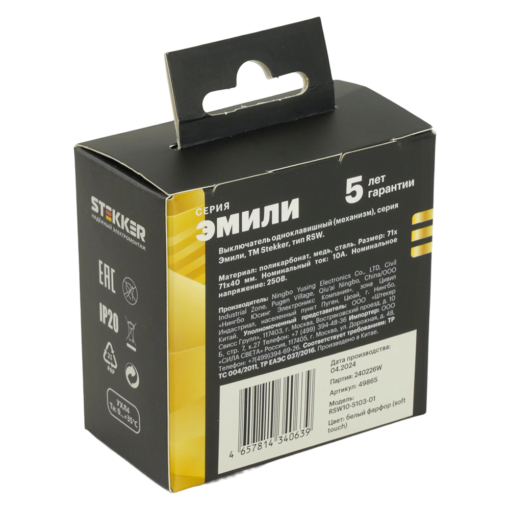 Производитель STEKKER Полное наименование Выключатель 1-кл 10А С/У Белый фарфор Эмили Код производителя (Артикул) 49865 Серия Эмили Код Просвет 013874 Высота изделия 40 Напряжение лампы, В 250 Номин. ток 10.0 Гарантийный срок, г 5 лет Единица измерения шт Степень защиты (IP) IP20 Цвет подсветки - Высота Упаковки, мм 46 Длина Упаковки, мм 80 Ширина Упаковки, мм 82 Цвет белый фарфор, soft touch -