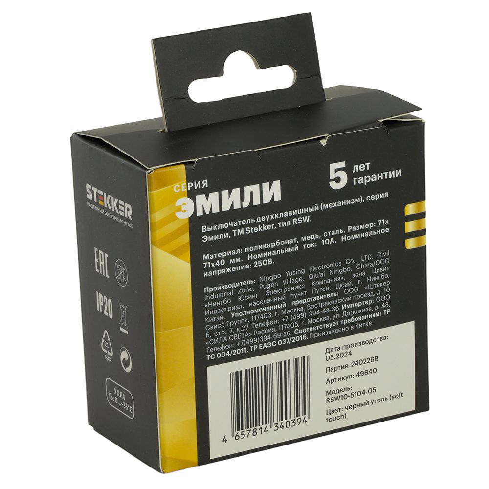 Производитель STEKKER Полное наименование Выключатель 2-кл 10А С/У Черный уголь Эмили Код производителя (Артикул) 49840 Серия Эмили Код Просвет 013849 Высота изделия 40 Напряжение лампы, В 250 Номин. ток 10.0 Гарантийный срок, г 5 лет Единица измерения шт Степень защиты (IP) IP20 Цвет подсветки - Высота Упаковки, мм 80 Длина Упаковки, мм 80 Ширина Упаковки, мм 46 Цвет черный уголь, soft touch -