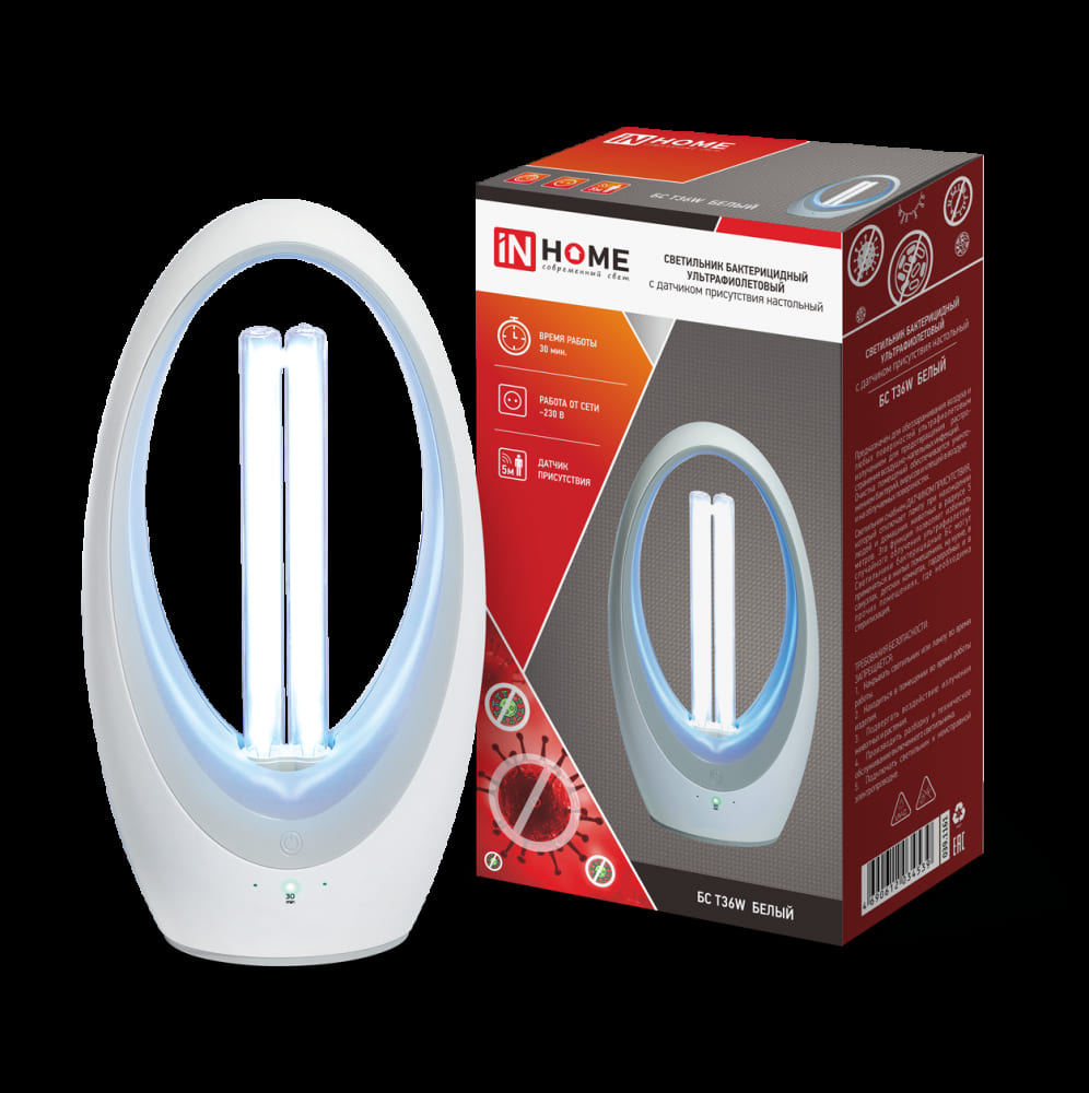 Светильник бактерицидный ультрафиолетовый настольный БС Т36W 36Вт белый с датчиком присутствия 230В IN HOME 4690612034539 в Иркутске